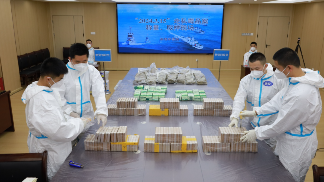 2024年3月,福建海警局破获“2024.3.15”特大走私毒品案,图为执法员对涉案毒品称量、取样