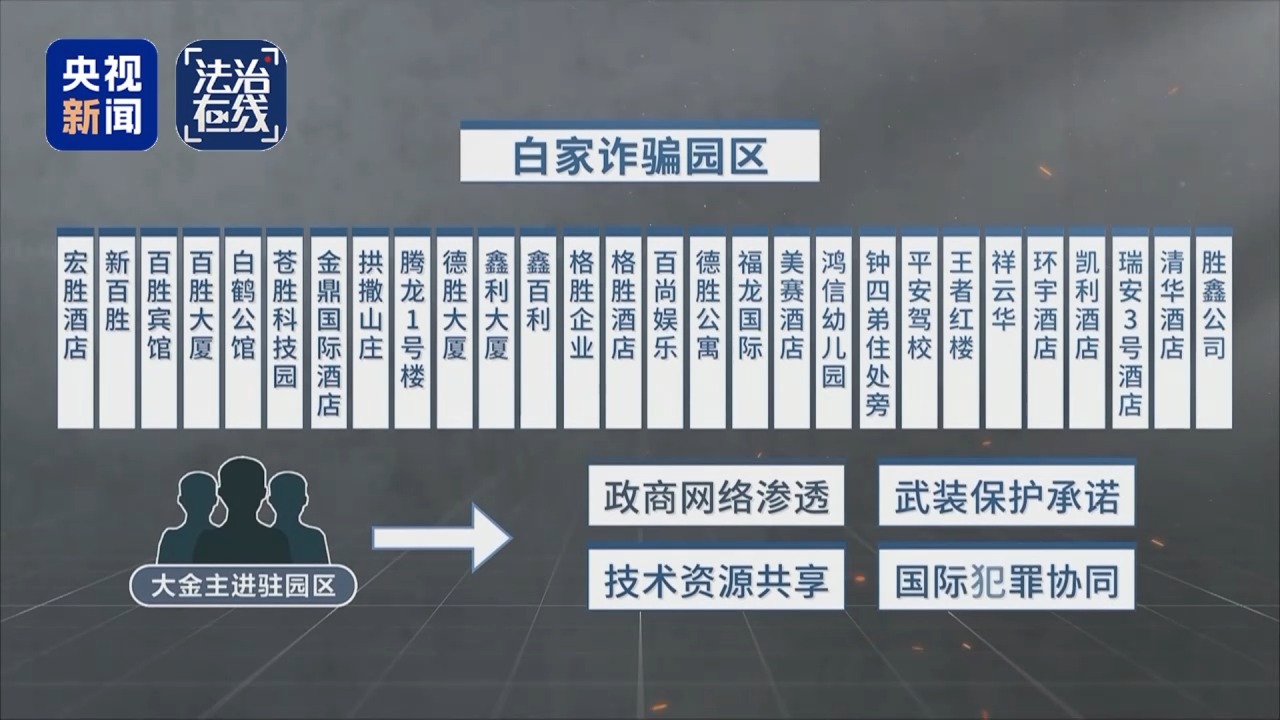 短短几年,白家通过政商网络渗透、武装保护承诺、技术资源共享以及国际犯罪协同等手段迅速建立并发展起了百胜、苍胜、腾龙、鑫百利等41个电诈园区,与此同时系统性地发展电诈金主,而金主选择手握哪个家族的“推广经营许可证”,最看重的当然是绝对实力。